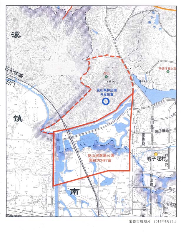 常德花山果林莊園項目地址位于常德市城區(qū)北郊武陵區(qū)南坪崗鄉(xiāng)花山村,距城區(qū)中心火車站廣場3.5公里。莊園東鄰柳葉湖(柳葉湖面13.84平方公里)西抵石長鐵路,園內(nèi)有九座山頭,五處山坳,座北朝南,依山傍水,山中有大小水庫二座,庫中有山,園內(nèi)參天古樹隨處可見,莊園地形海拔最高處171.8米,(是常德市周圍唯一能清晰觀覽整個城區(qū)全景之地),最底處海拔29.4米(柳葉湖面),每年有一萬多只白鷺在園內(nèi)棲息,花山也是民間傳說劉?抽怨适掳l(fā)生發(fā)源地,有古代遺址,全國聞名。