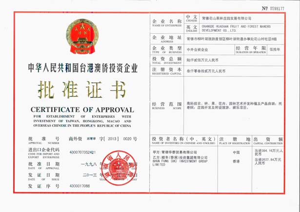 常德花山果林莊園發(fā)展公司是一九九八年十二月經(jīng)湖南省人民政府湘常審字(1998)0142號批準(zhǔn)成立的一家中外合資企業(yè),注冊資本980萬人民幣,公司法定地址:湖南省常德市武陵區(qū)南坪鄉(xiāng)花山村,經(jīng)營期限50年,公司經(jīng)營范圍主要是高科技農(nóng)、林、果、花卉、園林園藝綠化苗木種植銷售及莊園綜合開發(fā),旅游休閑娛樂,托老院,高檔住宅項目。公司經(jīng)常德市有關(guān)部門批準(zhǔn)獲得常德花山自然風(fēng)景區(qū)125.5公頃土地的 經(jīng)營開發(fā)權(quán)。